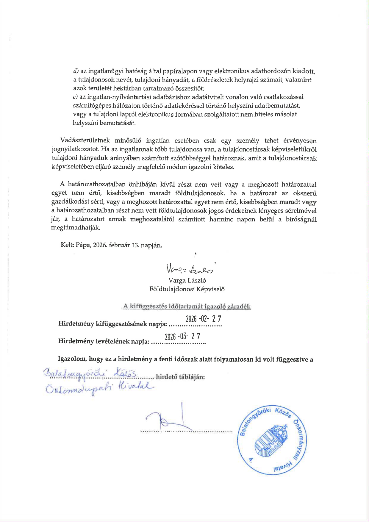 20-203560-506 számon bejegyzett vadászterület földtulajdonosi közössége közgyűlése 2026. március 25.